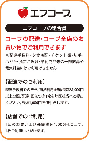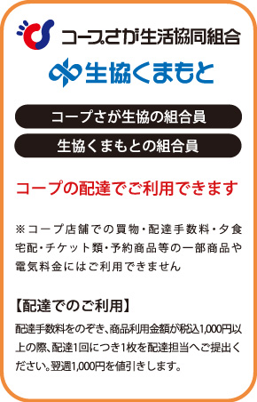 (※)生協によって店舗でのご利用ができない場合があります。詳しくは下記の「クーポンのご利用方法」をご覧ください。