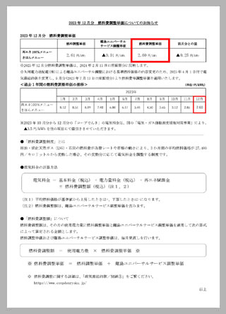 ホーム > 新着情報一覧 > お知らせ > 2023年12月分 燃料費調整単価についてのお知らせ