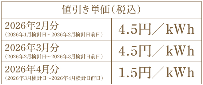 つきましては、経済産業大臣の承認を得ましたことを受け、支援の対象期間となる2026年2月分~4月分(2026年1月使用分~2026年3月使用分)について電気料金の値引きを予定していますので、以下のとおりお知らせいたします。